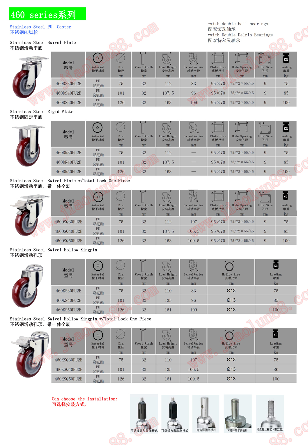 ◆ 輪子選配:全不銹鋼、尼龍、聚氨酯(PU)、超級(jí)人造膠(TPR)、耐高溫耐低溫、導(dǎo)電防靜電等。