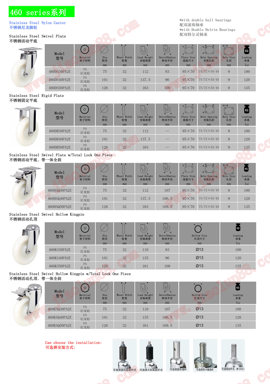 ◆ 輪子選配:全不銹鋼、尼龍、聚氨酯(PU)、超級人造膠(TPR)、耐高溫耐低溫、導電防靜電等。