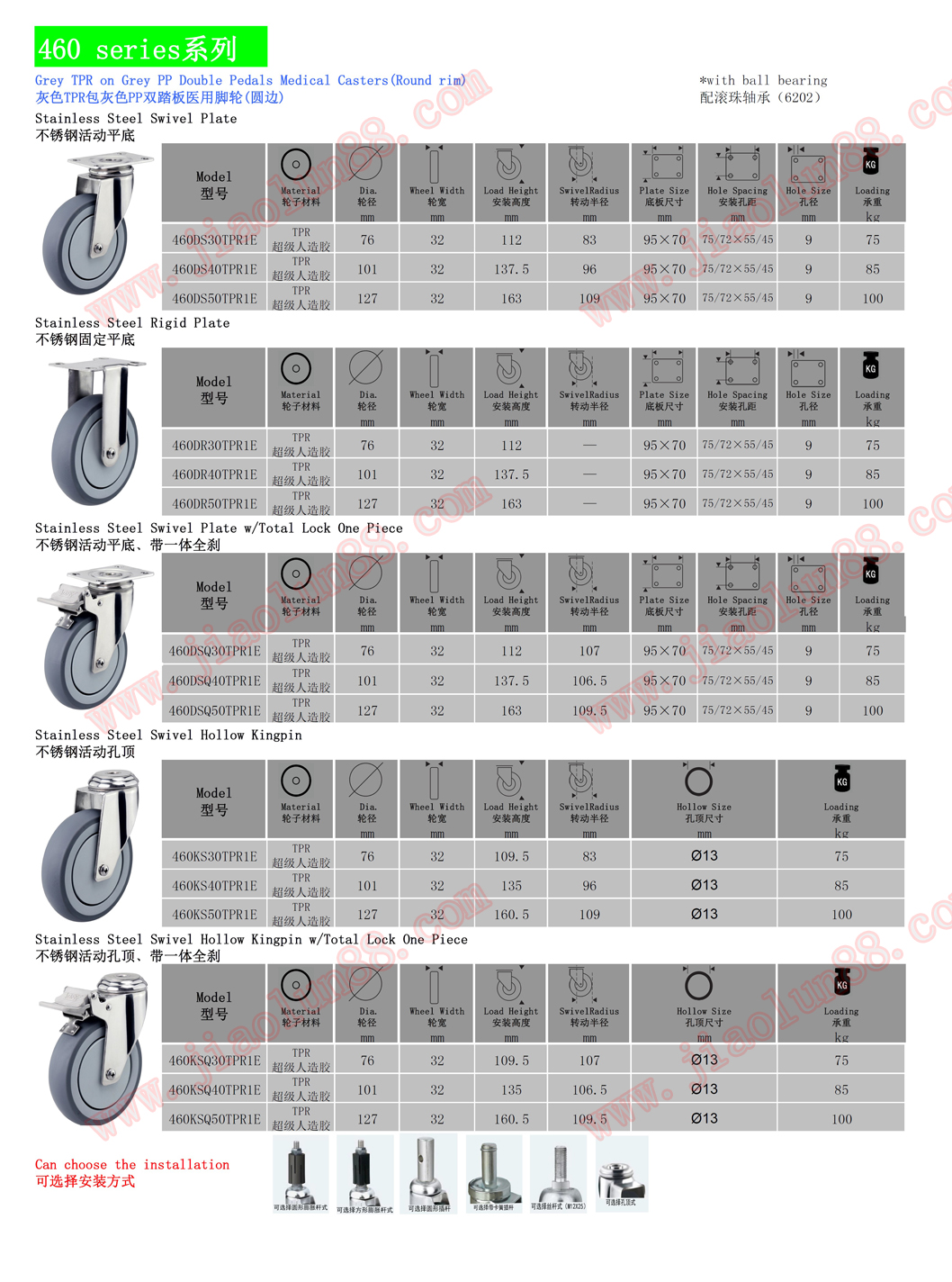 ◆ 支架選配:萬向、固定、萬向帶不銹鋼雙剎(同時(shí)鎖住支架和輪子)、孔頂、膨脹式。
