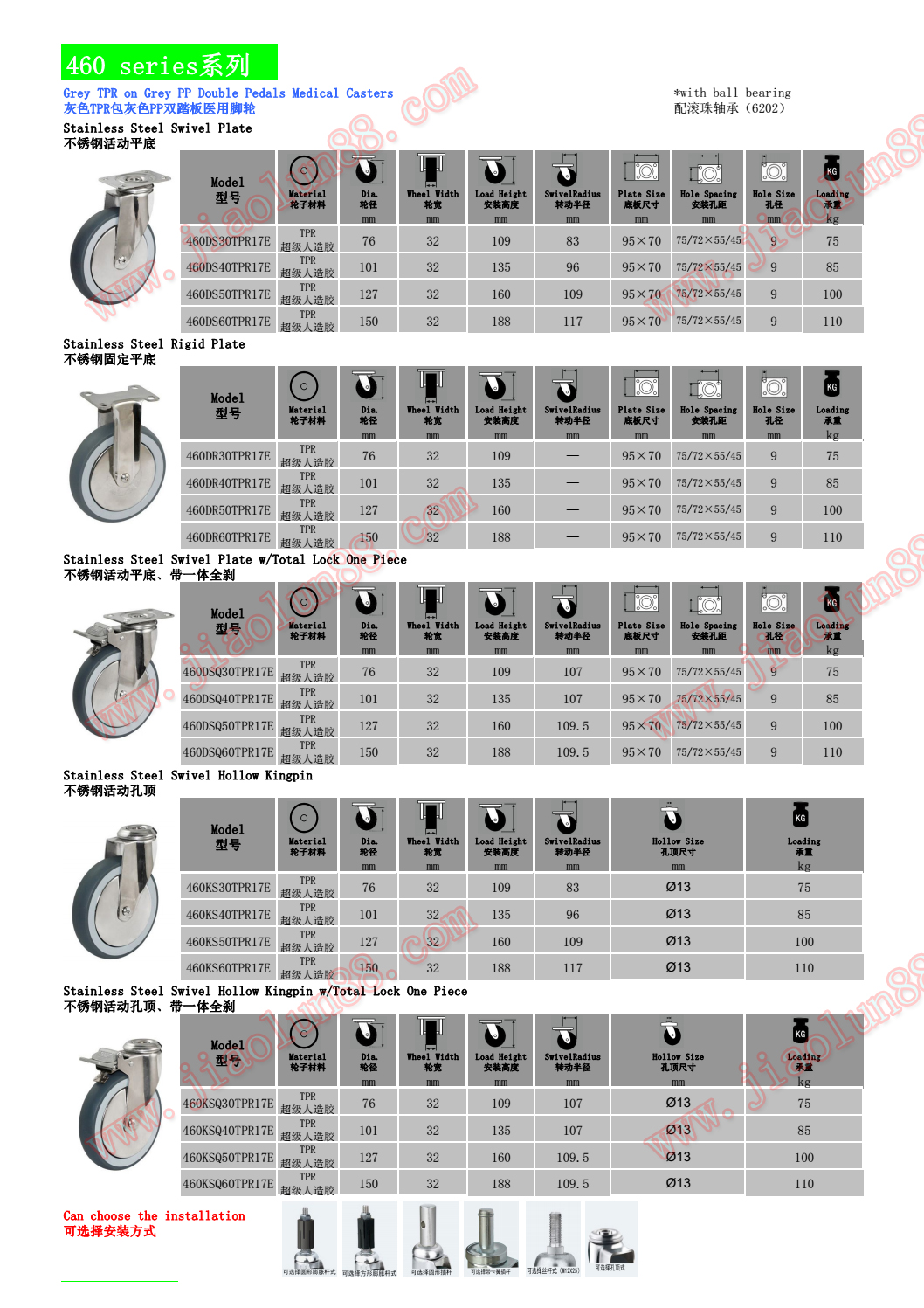 ◆ 輪子選配:全不銹鋼、尼龍、聚氨酯(PU)、超級(jí)人造膠(TPR)、耐高溫耐低溫、導(dǎo)電防靜電等。