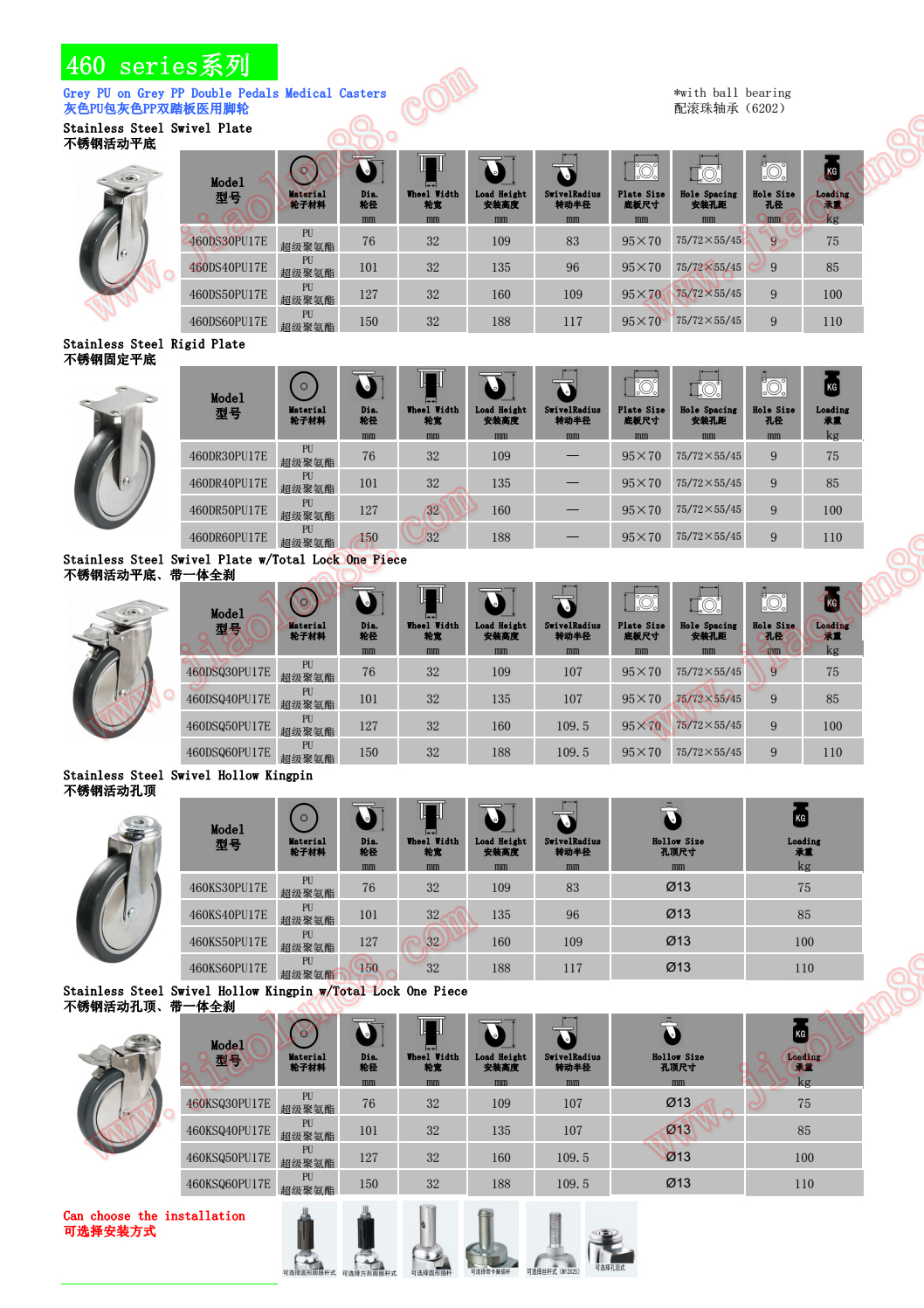 醫(yī)用不銹鋼腳輪參數(shù)特點(diǎn):(單輪最大承載110公斤)