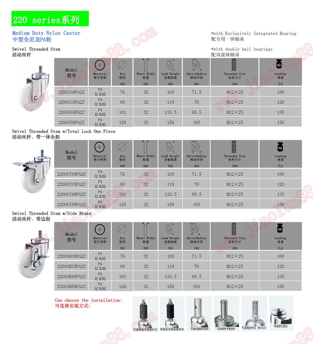 中型尼龍腳輪參數(shù)特點(diǎn):(單輪最大承載155公斤)