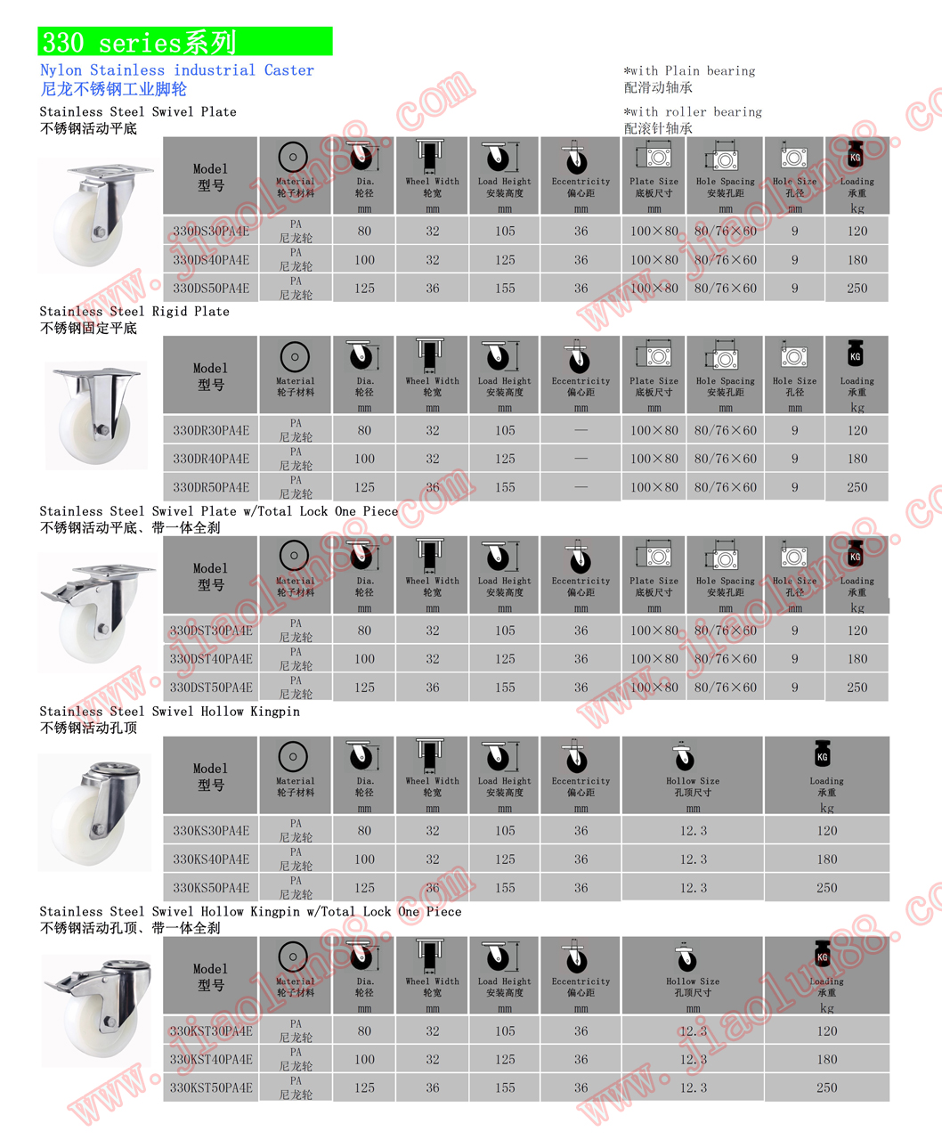 歐款304不銹鋼腳輪參數(shù)特點:(單輪最大承載250公斤)