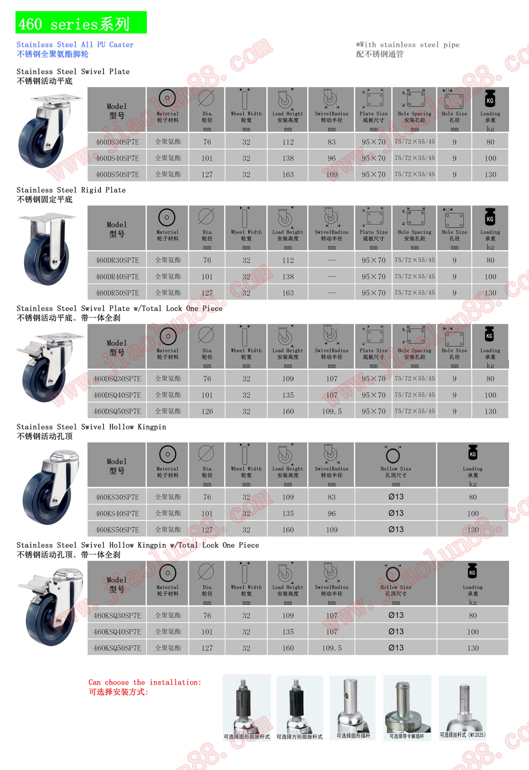 ◆ 輪子選配:全不銹鋼、尼龍、聚氨酯(PU)、超級人造膠(TPR)、耐高溫耐低溫、導(dǎo)電防靜電等。