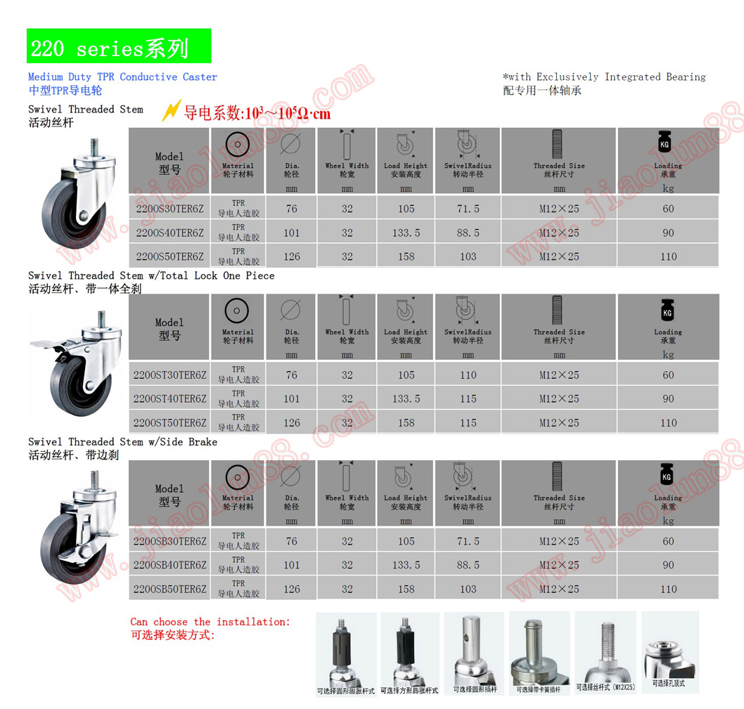導(dǎo)電腳輪參數(shù)特點:(導(dǎo)電系數(shù)10的3次方-10的5次方歐姆)