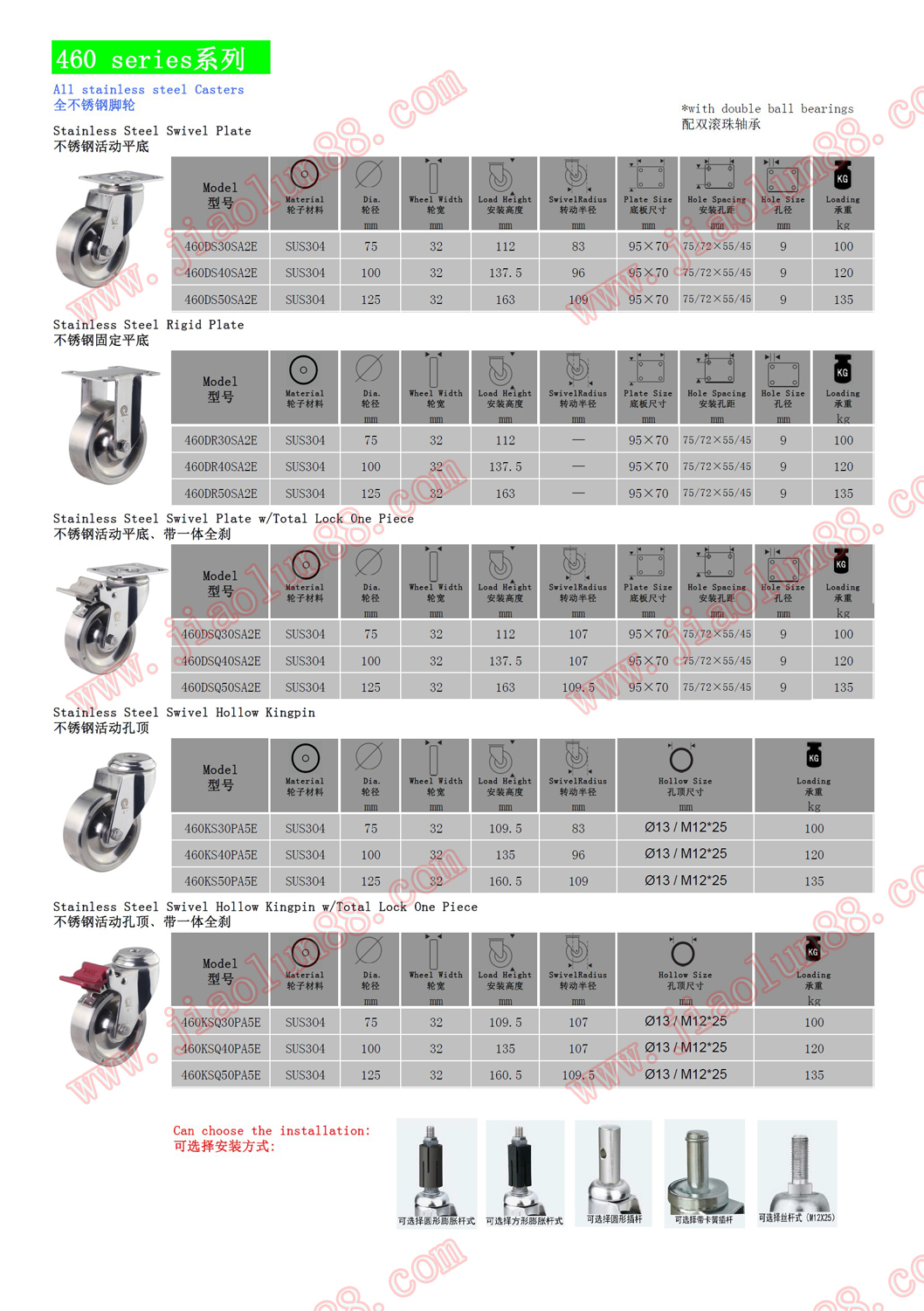 ◆ 支架選配:萬向、固定、萬向帶不銹鋼雙剎(同時(shí)鎖住支架和輪子)、孔頂、膨脹式。