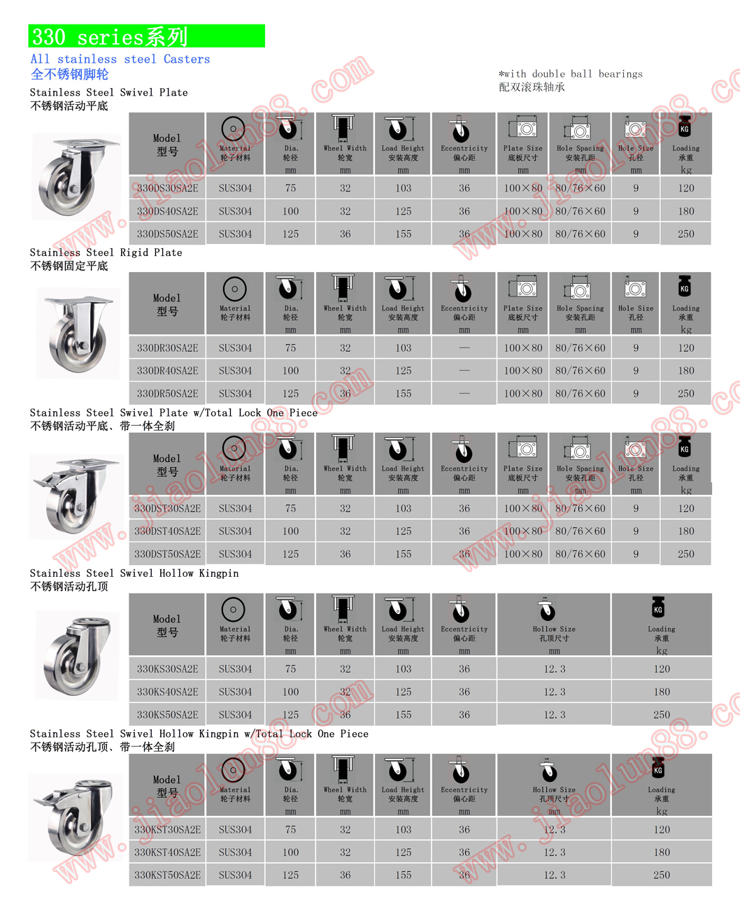 歐款304不銹鋼腳輪參數(shù)特點(diǎn):(單輪最大承載250公斤)
